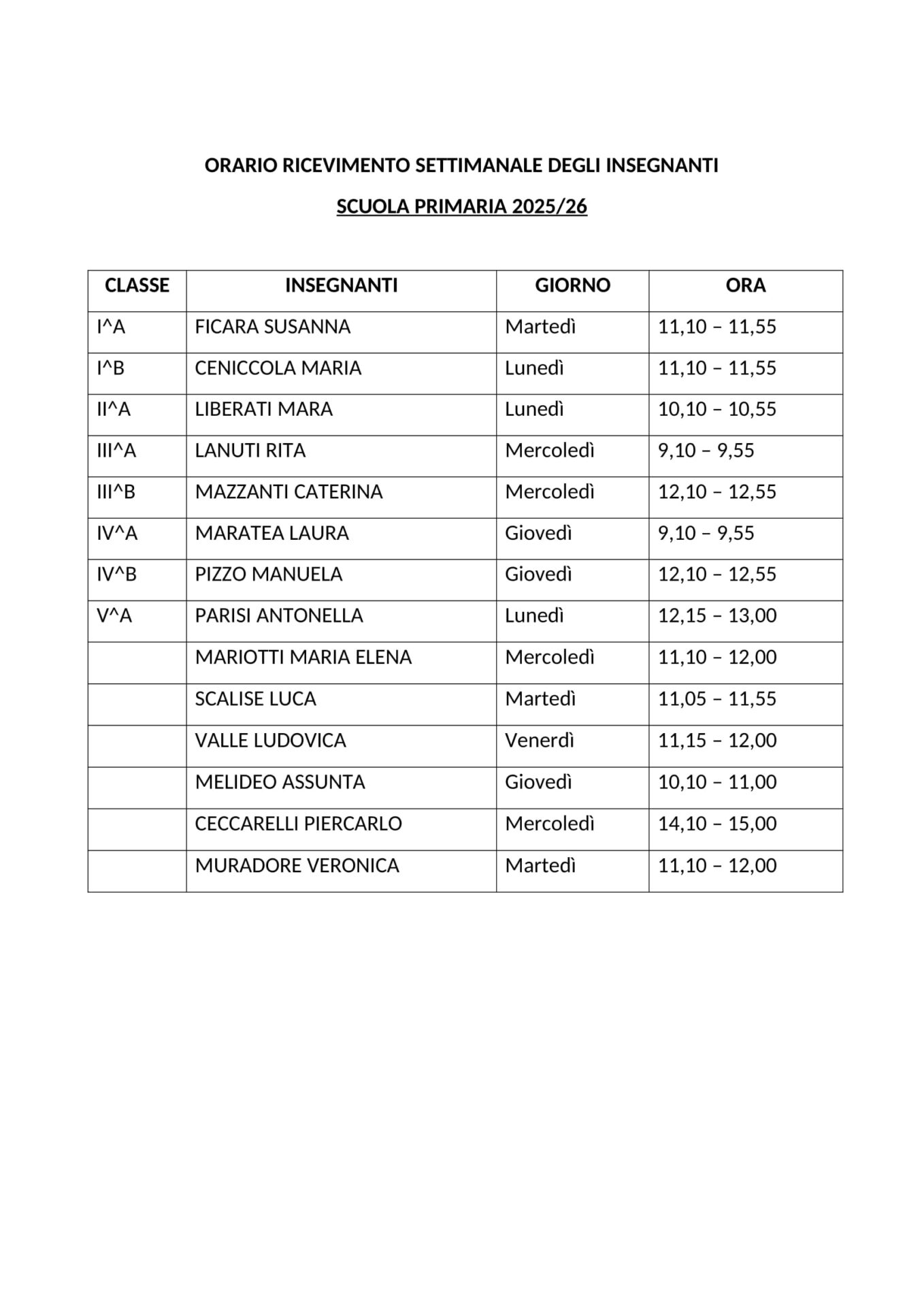Orario ricevimento docenti